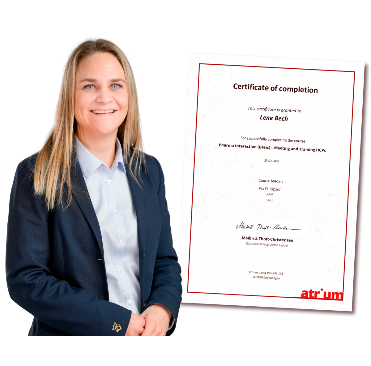 Hotel Koldingfjords relationschef Lene Bech har gennemført kurset Pharma Interaction (Basic) - Meeting and Training HCPs ved kursusleder Pia Philipsen, jurist, ENLI.