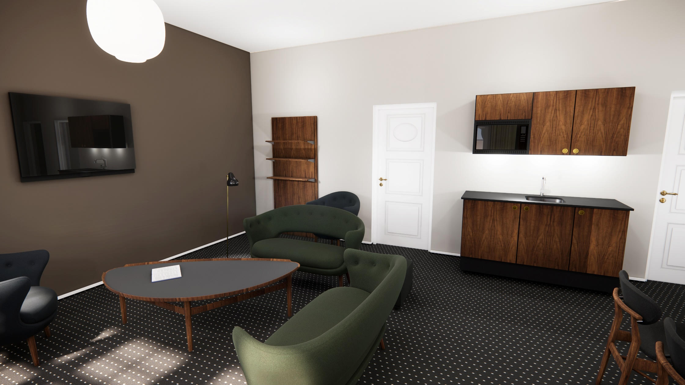 “Sofaer, borde og stole er alle tegnet af møbelarkitekt Finn Juhl, og det øvrige inventar er specialdesignet i egetræ og valnøddetræ. Alt er produceret i Danmark,” forklarer Lourdes Schwartz, der er indretningsarkitekt på projektet.